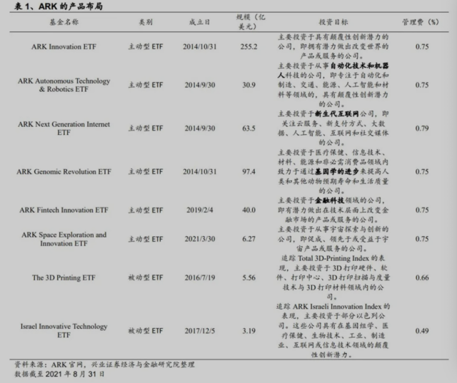 截至2021年8月31日,ARK目前共有ETF产品8只,ETF总规模502.02亿美元,其中6只为主动型权益ETF,规模共493.27亿美元,2只为被动型权益ETF,规模共8.75亿美元。代表性产品ARK Innovation ETF(简称ARKK)为公司的拳头产品,规模255.2亿美元,占据ARK ETF总规模的半壁江山。