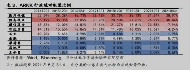 医疗保健一直是主导每年收益的重要行业,2017年比特币贡献26pct。除2015年之外,医疗保健的贡献一直十分突出,“成也萧何败萧何”,医疗保健在14、17、18、19、20年均贡献了显著为正的收益,而16和20年却贡献了明显的负收益。值得一提的是,ARKK 2017年87.39%的亮眼收益中,比特币贡献26个百分点,高于其他任一行业贡献。