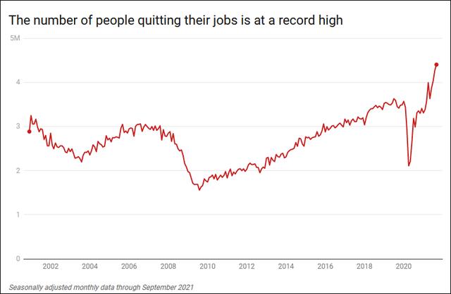 本世纪以来美国人辞职率走势,今年刷新了纪录(CNBC据美国劳工部数据制作)