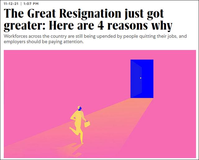 比如美国商业杂志Fast Company在12日报道中分析,“大辞职时代”到来的趋势,已经不容忽视,尽管美国各行各业都在寻求这个问题明确的答案,但一些劳动力分析人士猜测,这可能是多种因素共同作用的结果。