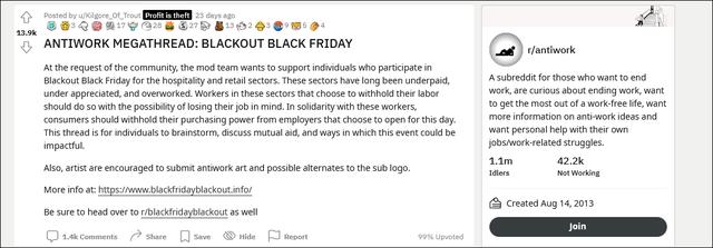 “抵制黑色星期五源于一个想法,即我们如何将目前的呼吁转化为现实的时间。”一位“反工作”板块的主持人说,“我们认为Reddit并非一个组织工人或群众行动的好地方,如果能把这种行动引入到线下社区中就太棒了。”