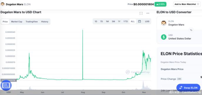 2021年4月,以马斯克名字命名的加密货币“狗狗埃隆火星币”(DogelonMars,代码ELON)上线交易,价格走势同样大起大落。