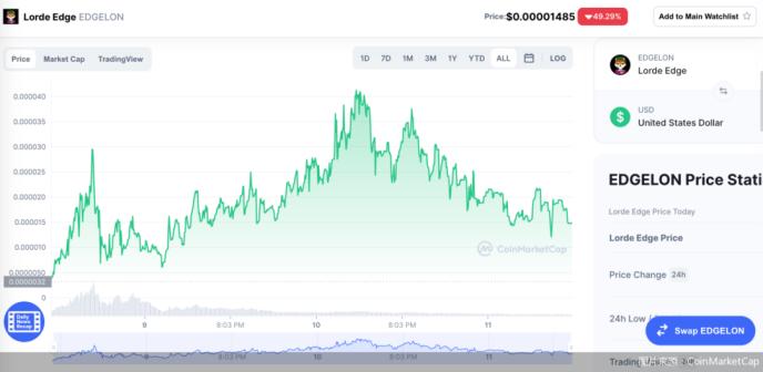 根据全球币价网站CoinMarketCap数据,诞生初期LordeEdge币交易价格为0.000003192美元,在上线后一天后达到0.00002954美元。11月10日,LordeEdge币触及历史高价0.00004132美元,较发行价上涨近1300%。