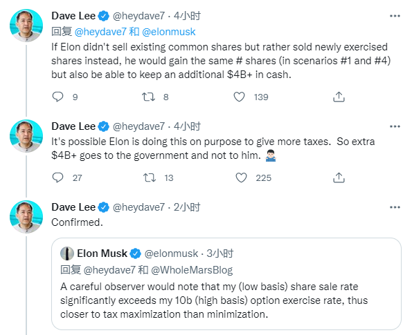 很喜欢与网友互动的马斯克马上回应称,“细心的观察者应可以注意到,我的(低基数)股票出售占比显著高于100亿(高基数)期权行权率,因此抛股这种做法更接近于税收最大化而不是最小化。”