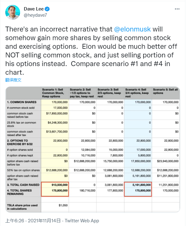 他在另外两条推特中指出,如果埃隆不出售老股,而是出售行权所获的股票,他将拥有同样的股份数量(情况一和情况四),同时还能获得额外的40多亿美元现金。埃隆这样做可能是为了增加税收,那额外的40亿美元给了政府而不是给他本人。