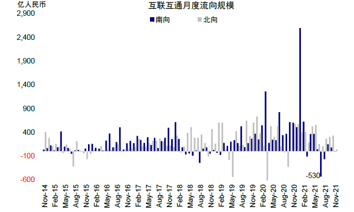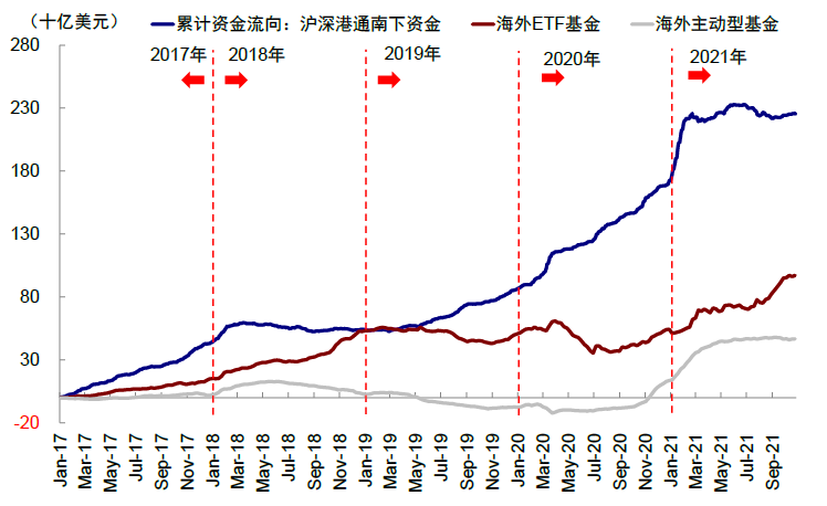 图表2:沪深港通南向 vs. 海外资金主被动资金流入