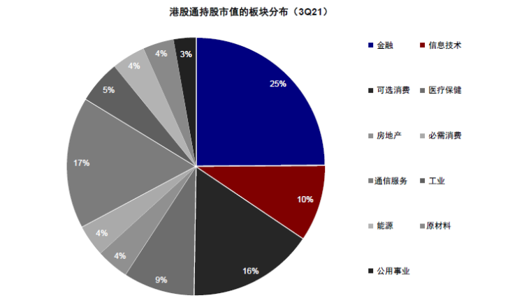 图表23:三季度港股通持股市值最高的三个板块分别为金融、信息技术和可选消费