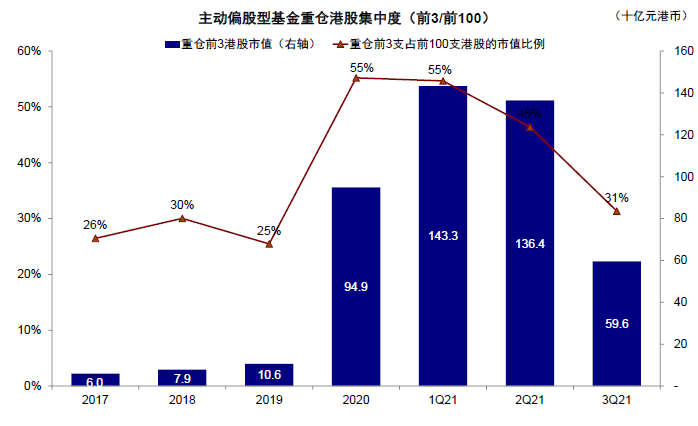 ► 从持股集中度看,“抱团”明显弱化,前3支重仓股占比降至31%。三季度公募基金前10支港持股市值占前100支重仓港股市值的59%,较二季度的72%明显下降。进一步看,前3支重仓股,即腾讯、药明生物和港交所的持仓市值约为596亿港元,较二季度前三大(腾讯、美团、香港交易所)重仓股的1364亿元港币下降56%。进而,占3支重仓股占前100重仓股的比例由二季度的46%进一步降至31%,“抱团”明显弱化。