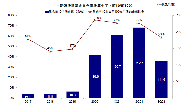 图表21:三季度公募基金前10支港持股市值占前100支重仓港股市值的59%,较二季度72%进一步降低