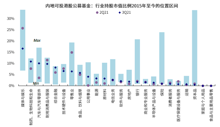 ►增减持:汽车零部件、公共事业、生物科技、综合金融、原材料增持最多;互联网娱乐、电商零售、耐用消费品减持最多。具体来看,三季度持股比例上升最快的行业为汽车及其零部件(10.1% vs. 二季度的3.6%)、公用事业(4.1% vs. 二季度的0.1%)、制药与生物科技(10.9% vs. 二季度的7.7%)、综合金融(8.2% vs. 二季度的6%)以及原材料(3.3% vs. 二季度的1%);相反,减持最多的行业分别为媒体与娱乐(16.7% vs. 二季度25.8%)、电商零售(6.5% vs. 二季度的14.9%)、耐用消费品与服装(9.8% vs. 二季度的11.5%)及医疗保健设备(0.7% vs. 二季度的1.9%)。