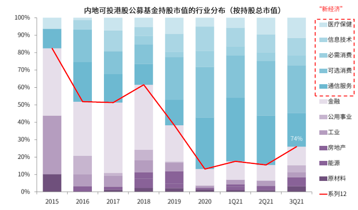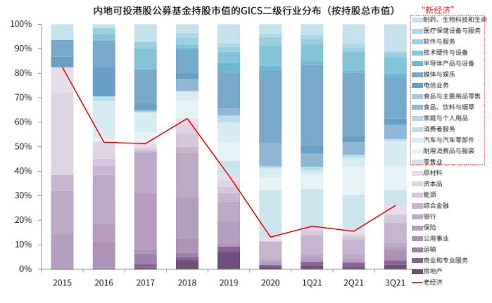 图表17:新经济仍是内地公募基金配置港股偏好,但老经济持仓有所提升,从二季末的15.5%增长至26%