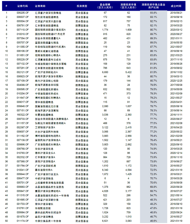 在样本选择上,与此前类似,我们依然将不包含QDII基金而仅通过沪港通投资港股的非货币公募基金作为分析对象。具体来说,只要章程中约定,基金便可以通过沪深港通投资港股,投资比例不超过股票资产的50%;如果基金名称带有“港股”字样,那么其港股投资比例不得低于股票资产80%[1]。