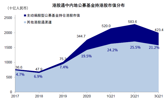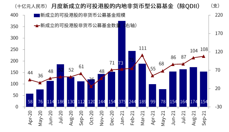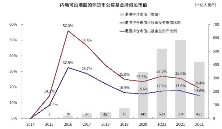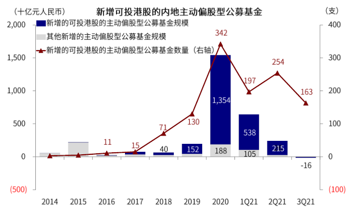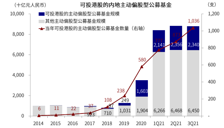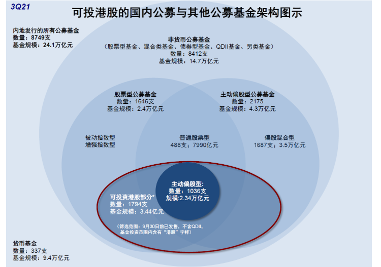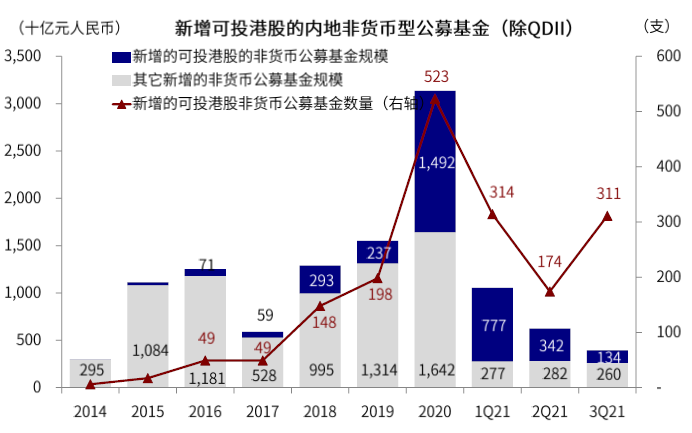 图表4:截至3Q21,可投港股的内地非货币型公募基金数量达到1794支,基金总规模约为3.4万亿元