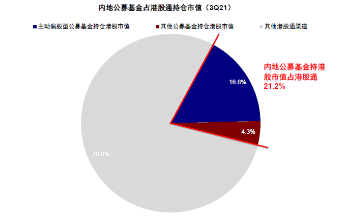 图表12:截至2Q21,内地公募基金持股市值占整体南向比例回降至21.2%
