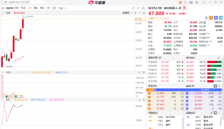 华盛资讯11月15日消息,微创机器人-B今日续涨9.89%,盘中创下股价新高,截至发稿,报67.8港元,成交9986万港元。