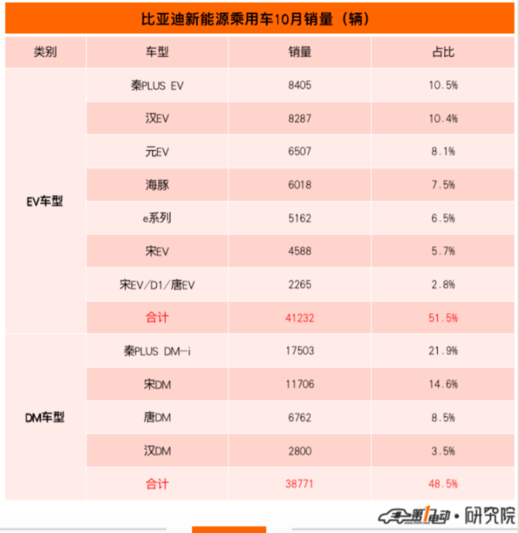 在比亚迪官宣的10月新能源销量80003辆里,各车型的销量是如何分布的?