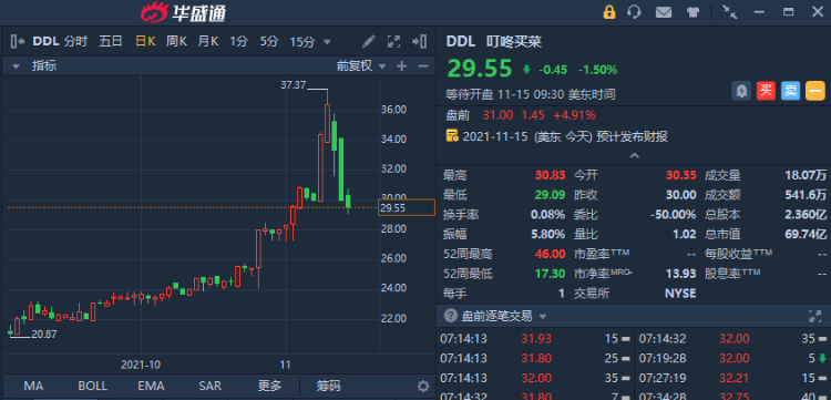 叮咚买菜盘前涨4.9%,第三季度(Q3)业绩报告显示,叮咚买菜该季度营收为61.89亿元,相较去年Q3同比增长111%。