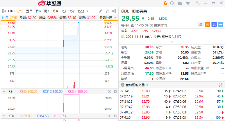 叮咚买菜(DDL)Q3营收61.89亿元,同比增长111%,盘前涨近10%