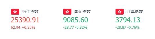 截至周一收盘,恒生指数涨0.25%,报收25390.91点 恒生科技指数涨0.54%,报收6601.15。国企指数跌0.32%,报收9085.6;红筹指数跌0.76%,报收3794.13。
