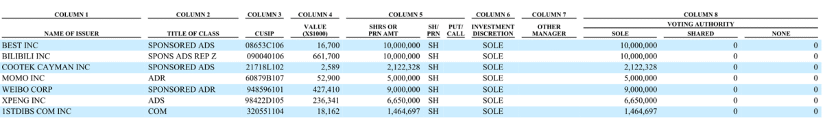 13F报告显示:阿里巴巴三季度末持仓总市值14.15802亿美元,对哔哩哔哩(B站)、微博、陌陌等7只股票的持仓保持不变。