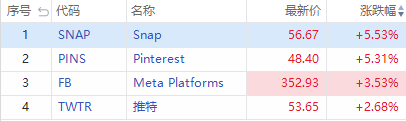 华盛资讯11月15日消息,美股社交媒体板块走强,Snap(SNAP)涨5.53%,Pinterest(PINS)涨5.31%,Meta Platforms(FB)涨3.53%,推特(TWTR)涨2.68%。