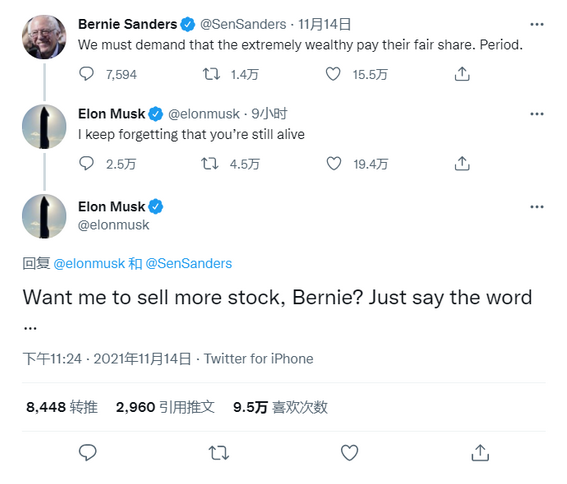 马斯克回应这位80岁参议员的推文称,“我一直忘了你还活着呢”。在随后一条推特中,马斯克再次追着问:“伯尼,想让我卖出更多股票吗?直说好了……”