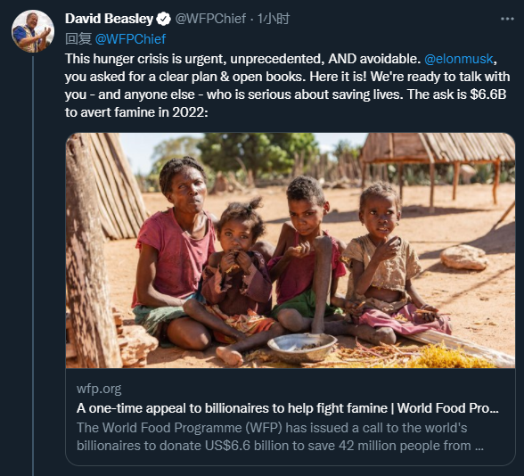 WEF公布后,署长David Beasley在推特上@埃隆马斯克,称这场危机是紧迫的、史无前例的,不过是可以避免的。“这就是你要的明确计划,我们时刻准备和你沟通,也准备着和其他真切希望拯救生命的人进行交流。”