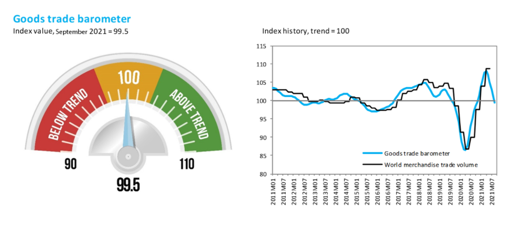 当地时间15日,世贸组织发布最新一期货物贸易晴雨表,读数为99.5,接近基准值100。同上期货物贸易晴雨表数值相比,此次读数出现明显下降,表明全球货物贸易在强劲反弹后开始放缓。主要原因是关键行业的生产供应出现中断,抑制了贸易增长,此外进口需求也开始减弱。