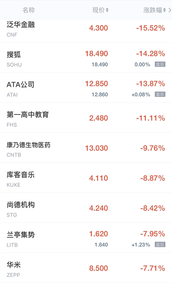 第一高中教育跌超11%,尚德机构跌超8%,兰亭集势跌近8%,虎牙跌超5%,斗鱼、腾讯音乐跌近5%,中网载线、房天下、爱奇艺、趣头条跌超4%,拼多多跌近4%,新东方、迅雷、微美全息跌超3%,前程无忧、世纪互联、讯鸟软件、途牛、乐居、满帮跌超2%,高途跌近2%,百度、京东、网易有道、叮咚买菜跌超1%,哔哩哔哩、欢聚集团跌近1%。