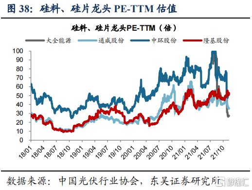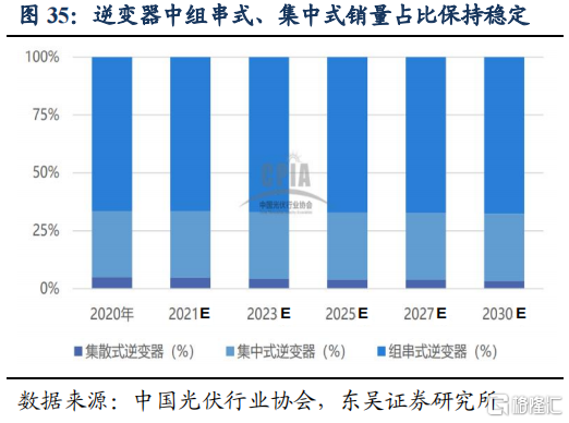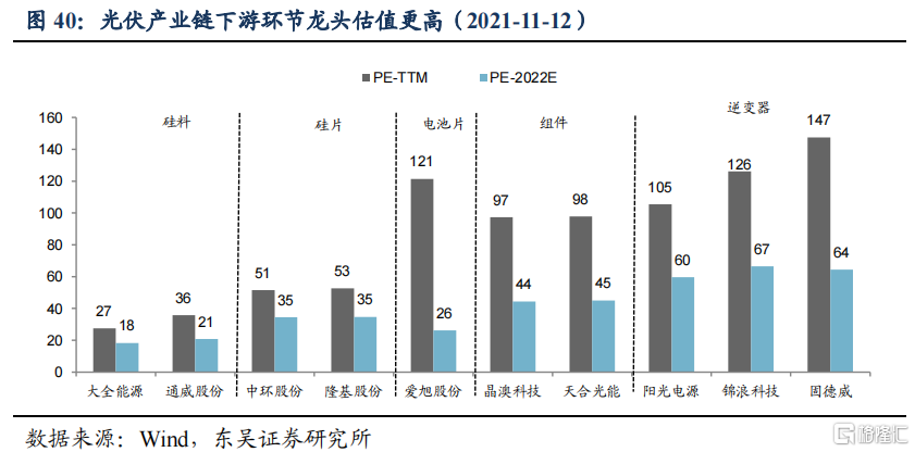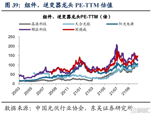 各环节估值差异大,下游组件、逆变器估值相对较高。2020年以来光伏产业链估值中枢整体提升,但各环节差异明显。横向对比PE-TTM(截至2021/11/12),下游组件公司晶澳科技(97倍)、天合光能(98倍),逆变器公司阳光电源(105倍)、锦浪科技(126倍)、固德威(147倍),远高于硅料公司大全能源(27倍)、通威股份(36倍),硅片公司隆基股份(53倍)。我们认为组件、逆变器可以获得相对较高的估值,可能原因在于技术路线风险较小,同时逆变器格局趋于稳定,龙头品牌效应带来估值溢价。根据光伏行业协会预计未来组串式逆变器和集中式逆变器仍是主要产品,且销量占比保持稳定,而硅片、电池片新技术迭出,技术路线具有较高的不确定性。