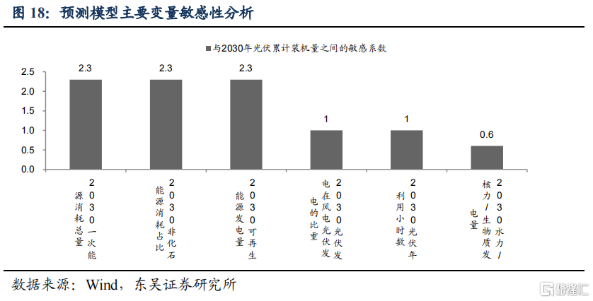 能源消耗总量及非化石能源占比对预测结果最为敏感。敏感性测算结果显示,2030年一次能源消耗总量、非化石能源消耗占比、可再生能源发电量与2030光伏累计装机量之间的敏感系数达到2.3为最高;光伏发电在风电光伏发电的比值、光伏年利用小时数的敏感系数为1;水力/核力/生物质发电量的敏感系数0.6为最低。考虑到我们主要从政策指引出发对能源总量及结构进行假设,我们预计其对预测结果的实际影响可能较小。