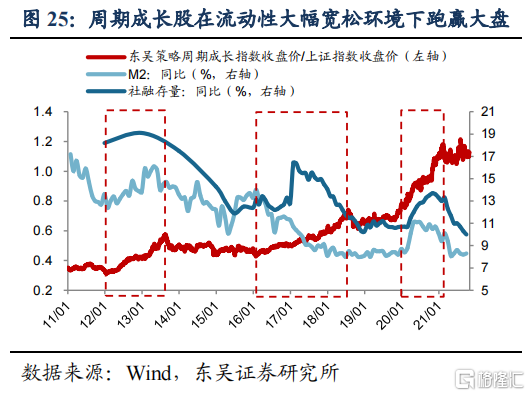 周期成长股占优区间集中在流动性宽松时期。我们从采掘、有色、钢铁、化工、建材、建筑等周期行业中,按照2010-2020年毛利率变异系数小于0.2,80%以上年份净利润实现正增长,上市时间超过10年,进行公司筛选,得到东吴策略周期成长股票池(见4.1附注),并等权重构建指数。2011年以来周期成长指数明显跑赢上证综指的区间集中在2012-2013年,2016-2018年以及2020年,三段区间内央行均有降准操作,如2012年1月、2012年5月、2016年3月、2020年1月,2012-2013年及2020年社融存量同比及M2同比均呈现上升,宽松的流动性环境更利于周期成长股。展望2022年,我们预计上半年,在国内经济下行压力之下,货币政策趋于宽松,可能利于周期成长股实现超额收益,特别是行业龙头。但6月之后美联储可能开启加息进程,若叠加国内CPI上行,或对货币政策形成掣肘,周期成长股可能面临较大估值折价压力。参考2013下半年、2018下半年、2021年初流动性收紧阶段,周期成长股相对上证走势均见顶回落。
