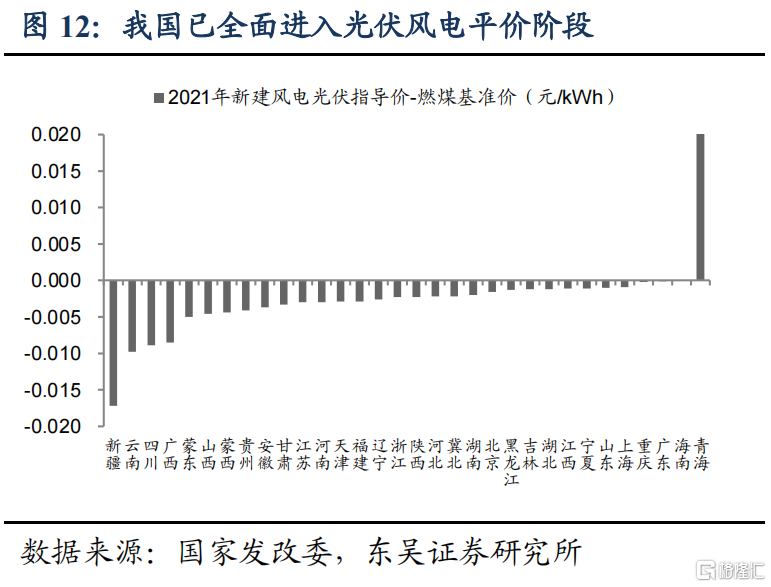 光伏进入全面平价阶段,成本下降驱动装机量提升。根据发改委2021年新能源上网电价政策,新建风电、光伏指导价在30个省市已降至燃煤基准价之下,意味着国内全面进入平价阶段。2010-2019年光伏度电成本下降最快,全球光伏度电成本由0.38美元/kWh降至0.07美元(0.45元人民币)/kWh,降幅达到82%,成本下降驱动装机量快速提升。更为关键的是,未来光伏发电成本仍可依靠技术进步实现持续下降。根据隆基股份、国家发改委能源研究所、陕西煤业化工集团《中国2050年光伏发展展望》预测,2025年光伏新增装机发电成本将低于0.3元/kWh,2035年、2050年新增发电成本有望降至0.2元/kWh、0.13元/kWh,持续推动光伏发电占比提升。考虑未来光伏成本较风电下降更快,我们假设2030年光伏、风电发电量比值为60:40。