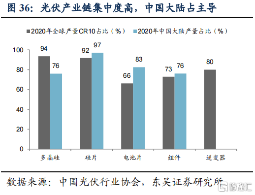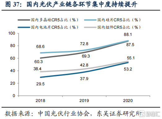 国内光伏企业已占全球主导地位,龙头竞争日益激烈。根据中国光伏行业协会数据,2020年中国大陆企业在多晶硅、硅片、电池片、组件环节的全球产量占比分别达到76%、97%、83%、76%,并且全球市场CR10均在60%以上,我国多晶硅、硅片、电池片、组件生产企业CR5在2020年达到87.5%、88.1%、53.2%、55.1%,表明全球市场份额已主要集中在国内少量龙头企业,未来龙头之间的竞争将日益激烈。