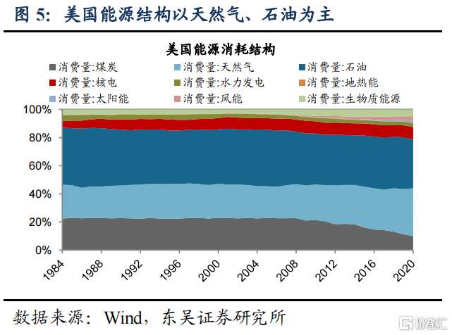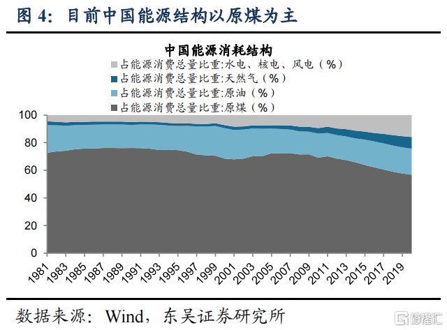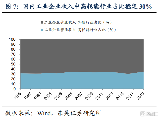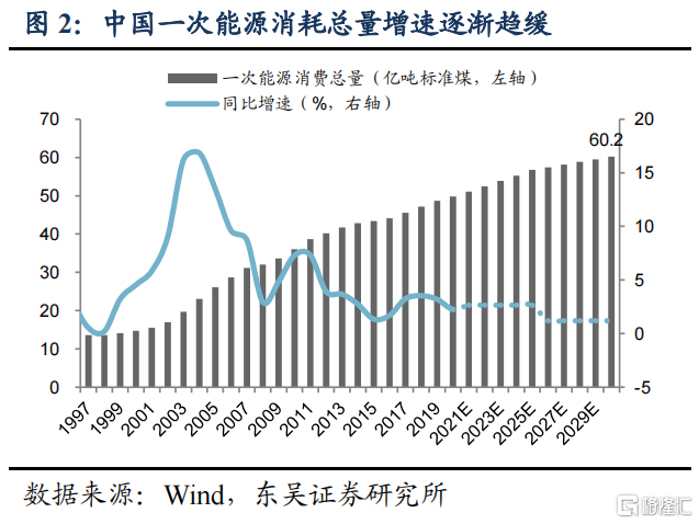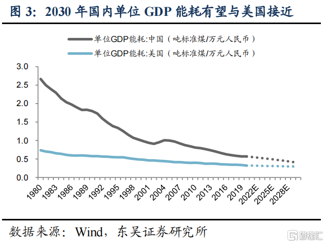 我们认为未来国内可通过调整产业结构和能源结构持续降低单位GDP能耗。产业结构方面,我们预计将努力压降高耗能行业,目前工业企业营收中高耗能行业占比稳定在30%左右,未来是调整重点;能源结构方面更清洁的非化石能源占比将显著提升。十四五规划提出目标:2025年单位GDP能耗较2020年降低13.5%;国网能源研究院预测“2030单位GDP能耗较2020年下降30%”,我们据此测算2030年国内一次能源消耗将达到60.2亿吨标准煤。国家能源局在《关于征求2021年可再生能源电力消纳责任权重和2022—2030年预期目标建议的函》中同样给出60亿吨的预测。