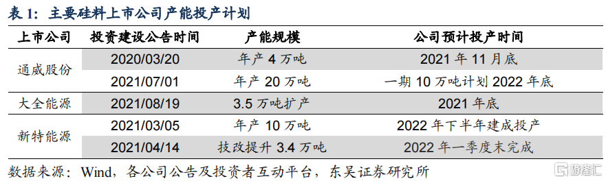 2022年硅料产能释放,关注中下游毛利扩张机会。2021年硅料涨价是行业关键词,原因在于下游需求快速增长,但硅料供给受制于产能周期长、能耗双控等影响,持续紧张。展望2022年,硅料主要厂商新增产能将陆续投产,其中通威股份2021年11月底新增产能4万吨、大全能源2021年底新增3.5万吨、新特能源2022Q1新增3.4万吨,我们预计硅料供给紧张将逐渐缓解。2022年下半年通威股份10万吨、新特能源10万吨产能也将投产,进一步解决硅料供给,硅料价格有望持续回落。我们认为成本压力减轻利好中下游硅片及组件厂商毛利恢复,若装机需求保持高增,则有望实现量价齐升。