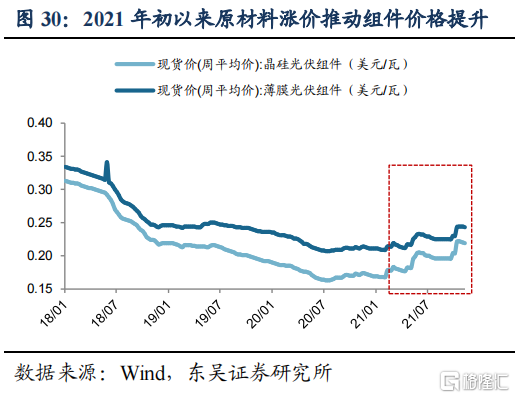 产业链整体涨价,短期或影响装机进程。2020Q4以来受需求增长、产能有限的影响,光伏产业链各环节产品价格普遍大幅上涨,2020/12/30至2021/11/12,多晶硅料由10.6美元/kg上涨至35.6美元/kg,涨幅236%;推动单晶硅片(156mm*156mm)价格由0.5美元/片上涨至1.07美元/片,涨幅114%;电池片价格由0.09美元/W上涨0.13美元/W,涨幅44%;除含硅产品外,EVA薄膜价格由1.63万元/吨上涨至2.34万元/吨,涨幅44%;上游材料全线上涨倒逼晶硅/薄膜组件价格由0.17/0.21美元/W上涨至0.22/0.24美元/W,涨幅分别29%、14%。在普通地面电站项目成本构成中,光伏组件、其他电器设备、支架等设备占比超75%,今年设备成本的普遍上涨可能在短期内影响发电成本的继续下降,拖累装机增长进程。并且成本上涨已经对中下游公司毛利造成较大压力,2021Q3单季度毛利率,隆基股份18.9%较2020Q3(下同)下降6.9pct,晶澳科技15.5%下降5.4pct,天合光能13.9%下降4.2pct。