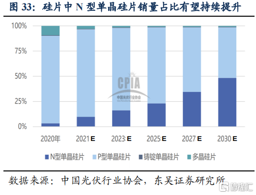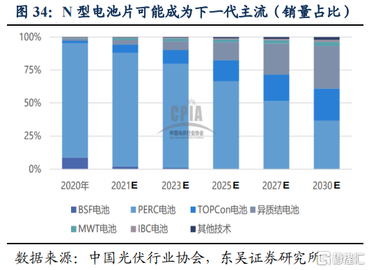 硅片、电池技术路线多样,硅料、逆变器相对稳定。技术进步带动成本下降效率提升是行业发展的重要驱动力,但效率的跃升往往意味着新技术的更迭。根据光伏协会预测,硅片、电池片技术路线明显更多,目前主流硅片类型是P型单晶硅片,2020年销量占比86.9%,未来N型单晶硅片占比将有明显提升;电池片环节,目前主要产品PERC电池2020年销量占比86.4%,未来N型电池中的异质结和TOPCon电池占比将明显提升,有望成为下一代主流技术。我们认为技术路线的多样对于个体公司具有两面性,机遇在于存在提前布局及超车机会,风险在于转向缓慢则会迅速丧失市场优势。这就要求公司在做好当下主流技术生产的同时,把握未来技术路线的甄别,对公司及投资人的专业能力都提出较高要求。