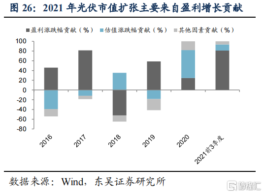光伏板块涨幅贡献拆分,2020年靠估值,2021年靠业绩。我们将Wind光伏指数市值变动拆分为盈利(净利润TTM)涨跌幅贡献、估值(PE-TTM)涨跌幅贡献、其他因素贡献,2020年板块市值扩张源于戴维斯双击,盈利及估值均有正贡献,估值贡献达到57%;2021年前3季度板块市值扩张更多来自盈利的扩张,其贡献达到81%,估值贡献仅12.5%。展望2022年,若光伏产业链继续维持高景气,同时流动性偏于宽松,我们预计板块市值仍有扩张空间。