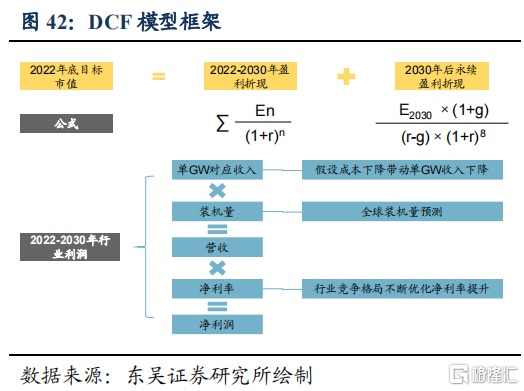 ⑦DCF模型:参考全球装机预测,假设行业营收及利润增速,参考权益基金收益率给定折现率,量化测算未来市值空间。