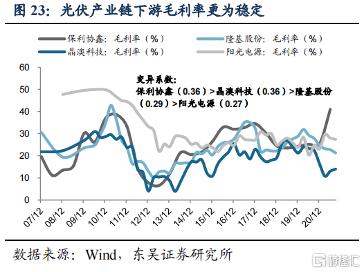 光伏周期成长属性明显,产业链自上而下周期性减弱。光伏产业链作为制造行业,天然具有供需变动带来的周期属性,但从中长期来看行业增长空间较大,兼备周期及成长属性。市场对于周期股及成长股往往给予不同的估值水平,我们从产品价格波动、产能释放周期、公司毛利稳定性等角度讨论不同环节的周期成长属性。产品价格方面,2010年以来各环节价格均呈现下降趋势,但上游硅料价格波动性明显更强,中游硅片及电池片价格虽有波动但周期性减弱,下游组件价格波动最小。产能释放周期来看,根据通威股份公告,硅料自开建到投产需要18个月,再考虑半年的品质爬坡期,整体产能释放周期在24个月左右;根据隆基股份公告,硅片建设投产周期在24个月;根据晶澳科技、上能电气公告,电池片、组件、逆变器投产周期分别为6个月、8个月、6个月,中上游投资扩产周期明显更长,供给灵活度偏弱。主要公司毛利率变动来看,2007年以来毛利率波动的变异系数,保利协鑫(0.36)=晶澳科技(0.36)>隆基股份(0.29)>阳光电源(0.27)。综合来看,光伏产业链符合制造业传统规律,即越上游的环节(硅料、硅片)周期性更强,中下游组件及零部件周期性偏弱。