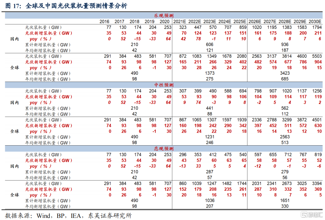 光伏具有一定基建属性,且受政策影响较大,在长期空间预测中对具体各年节奏较难把握,如2018年531新政后国内光伏新增装机量连续2年负增长。因此,本章重点对长期光伏装机量空间进行测算讨论。