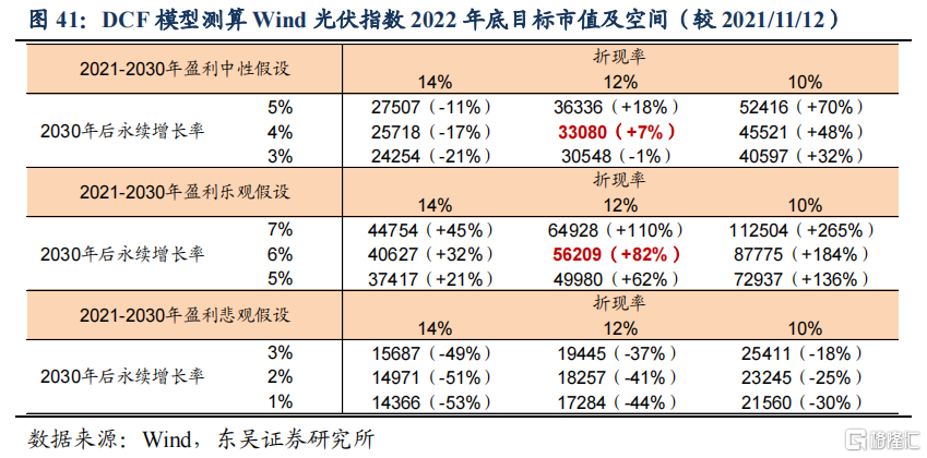 DCF测算2022年光伏市值变动空间,中性-乐观假设下可能上行7%-82%,悲观假设下可能的下跌空间-41%,具体幅度需跟踪基本面景气。展望2022年流动性假设,我们认为国内货币政策整体基调偏于积极,但大幅宽松的可能性较低,因此模型折现率给定12%。根据DCF测算结果,增长率中性及乐观假设下光伏指数2022年仍具有上行空间,2021-2030盈利中性假设、2030年后永续增长率4%对应市值增长空间7%,2021-2030盈利乐观假设、2030年后永续增长率6%对应市值增长空间82%,2021-2030盈利悲观假设、2030年后永续增长率2%对应市值下跌-41%。我们预计具体涨幅受政策消息面及基本面景气影响,如果后续利好政策持续出台,市场继续保持乐观情绪,给予长期乐观假设;如果后续政策面趋弱、景气下滑,市场预期可能转向中性。