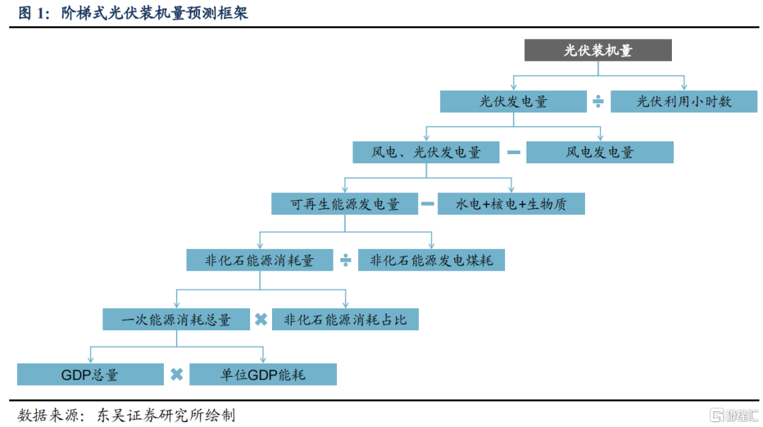 ②从能源结构出发构建光伏“阶梯式”预测框架,以长期装机量为落脚点,核心假设包括能源消耗总量及结构等。