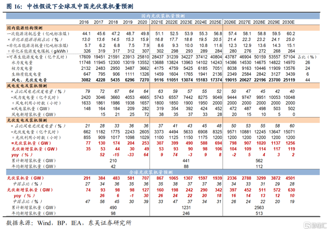 中性假设下,我们预计2030年国内光伏累计装机量1256GW,较2020年增长396%,年均新增装机量2021-2025年88GW、2026-2030年112GW,较2016-2020年提高110%、167%。根据上文分析,给定关键变量假设:2030年国内一次能源消耗60.2亿吨标准煤、其中非化石能源占比25%、水电发电量1.5万亿kWh、核电发电量1.36万亿kWh、生物质发电3439亿kWh、光伏风电发电量比值60:40;其他变量假设:2030年非化石能源发电煤耗264g标准煤/kWh(2020-2030年CAGR为-1.5%)、年光伏利用小时数1200小时、年风电利用小时数2000小时。其中光伏利用小时数在2021-2025年逐级递增,2026-2030年稳定在1200小时,主要考虑部分新增装机量在首年有效工作时长较短,随着装机量提升这一现象将有所改善。据此,我们预计2025、2030年国内光伏累计装机量达到694GW、1256GW,较2020年增长174%、396%;2021-2025、2026-2030年均新增装机量88GW、112GW,较2016-2020年提高110%、167%;2022-2025年新增装机量CAGR 18.6%。