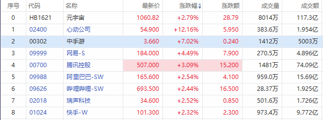 港股元宇宙概念股走高,心动公司涨超12%中手游涨超7%