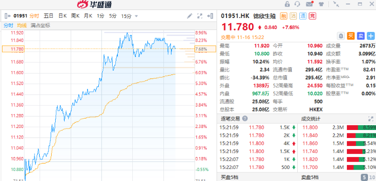 华盛资讯11月16日消息,锦欣生殖低位反弹,午盘升幅扩大至8%。截至发稿,锦欣生殖涨7.68%,报11.78港元,成交额3.099亿港元。