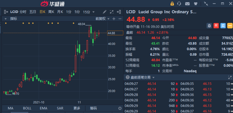 LucidGroup(LCID)盘前涨2.16%,第三季度客户预订量上升至1.3万辆,并有望在2022年实现生产2万辆汽车的目标。