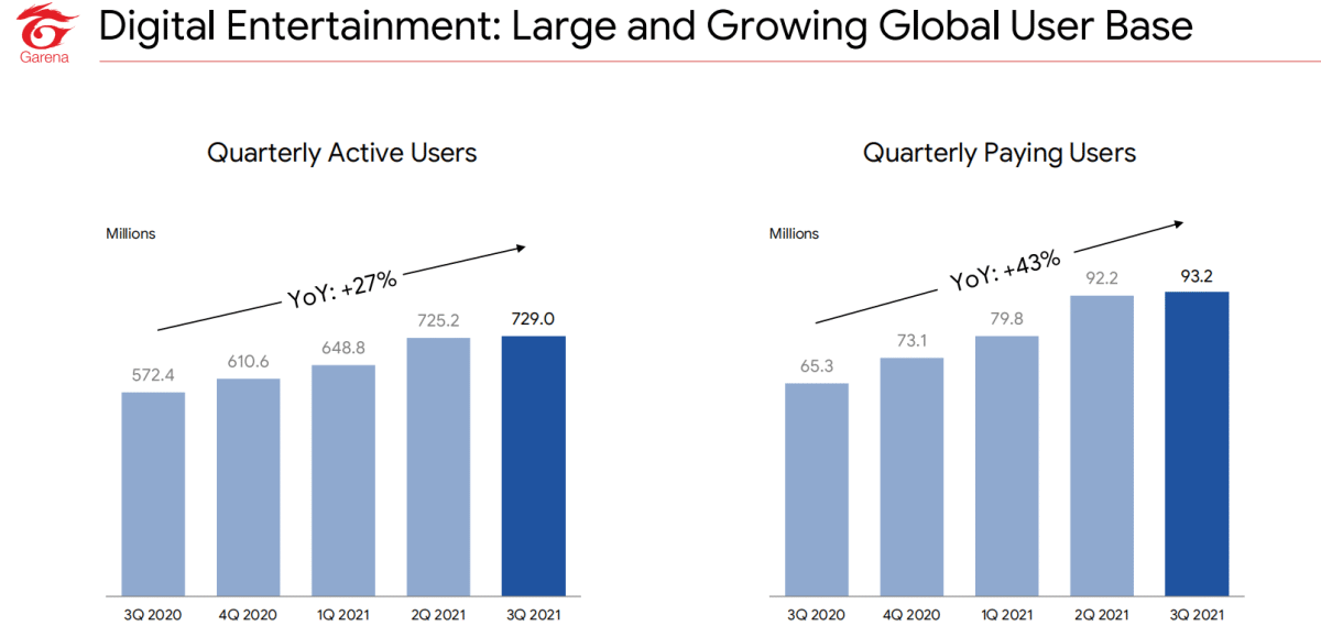 Garena季度活跃用户达到7.29亿,同比增长27%,季度付费用户达9320万,同比增长43%。