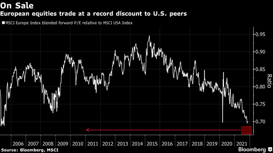 不过,Oppenheimer表示,债券并不是特别好的对冲工具,并呼吁更多元化的地域风险敞口。例如,欧洲股票可能是投资者寻找价值的好地方,因为它们目前相比美国同行出现创纪录的估值折让。